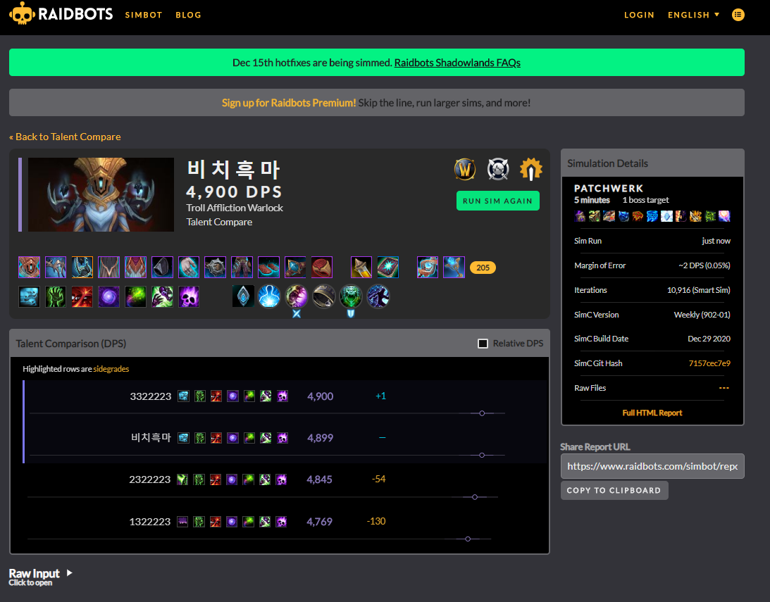 어느정도 와우를 했다면 심크라는 것을 한번쯤 들어봤을겁니다. 심크란(simc) simulation craft의 줄인말인데 내 캐릭터의 심크를 돌리면 내 캐릭터의 dps를 컴퓨터가 계산해주는것 입니다.