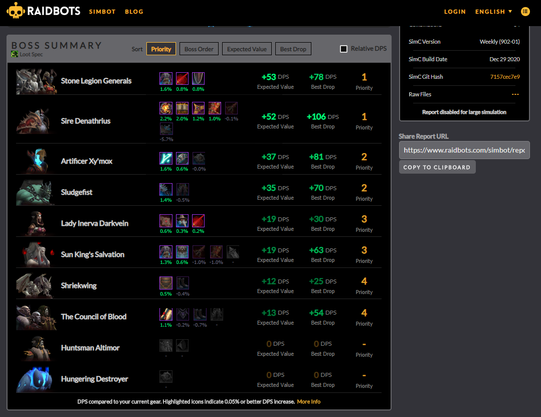 저에게 1순위는 Sire Denathrius 데나트리우스를 잡고 Dreadfire Vessel이라는 장신구를 먹는게 dps가 106이 오르는 제일 좋은 방법이라는 뜻입니다.
