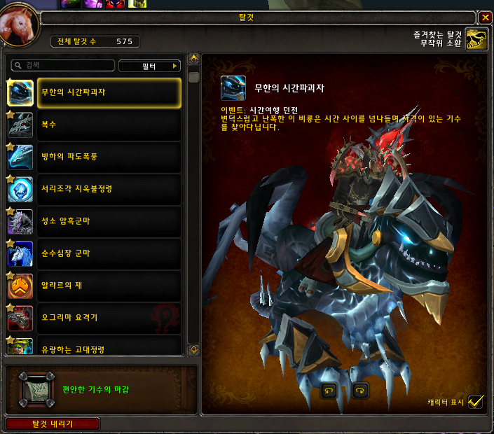 무한의 사긴파괴자탈것은 시간여행던전에서 각보스를 잡으면 일정확률로 획득가능합니다.