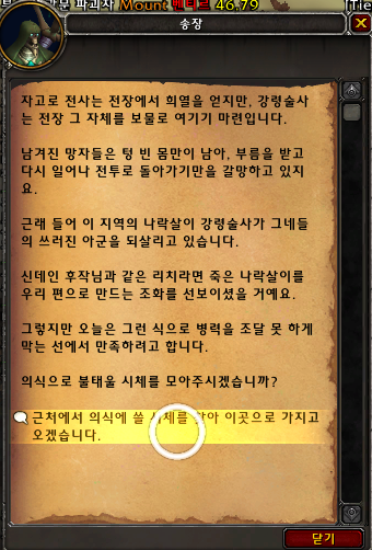 송장에게 말을걸면 시체파리가 소환되는데 말을거는것은 강령군주 캐릭터만 가능합니다.