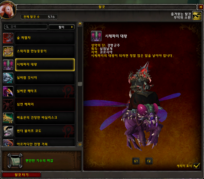 시체파리 대왕 탈것은 9.1패치 코르시아에서 획득가능한 탈것입니다.