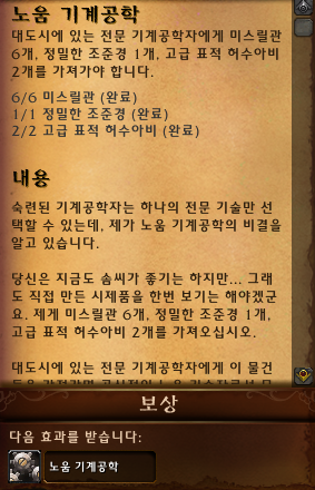 잔달라 기계공학, 군단 기계공학, 드레노어 기계공학, 판다리아 기계공학, 대격변 기계공학, 노스렌드 기계공학, 기계공학으로 나뉘어져있는데
