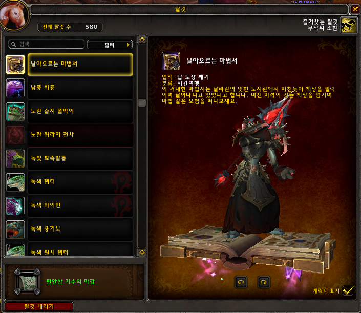 날아오르는 마법서 탈것은 9.15에 추가된업적으로 군단 시간여행 마법사의탑 7개의 맵을 전부완료하면 획득 가능합니다.