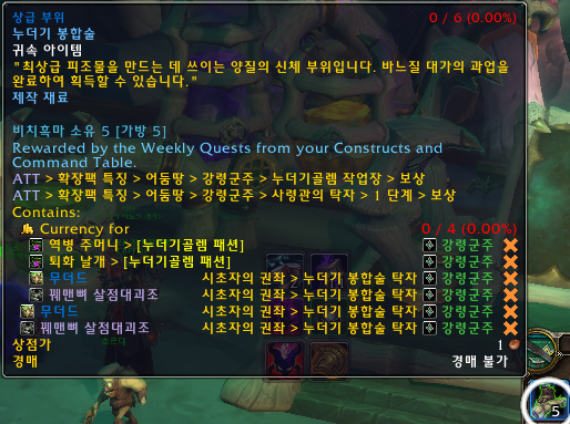 누더기 작업장은 피조물들을 만들고 피조물들이 주는 주간퀘를 완료하는 방식입니다.