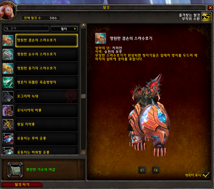 영원한 겸손의 스라수호기 탈것은 키리안만 획득가능합니다. 구매하는 탈것인데 조건이 업적달성입니다.