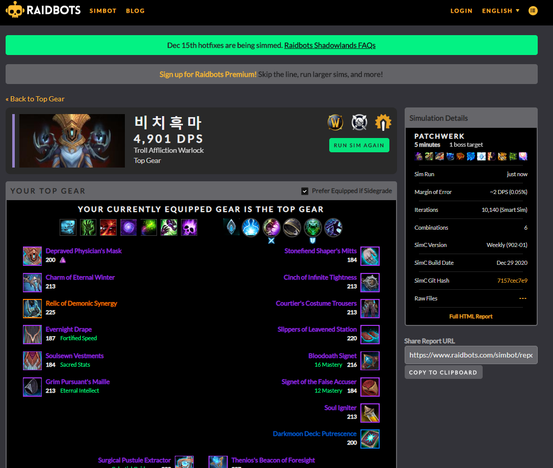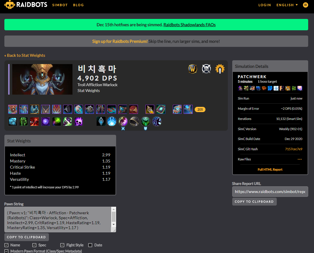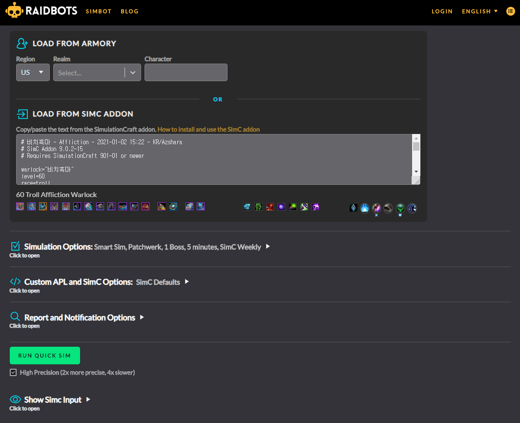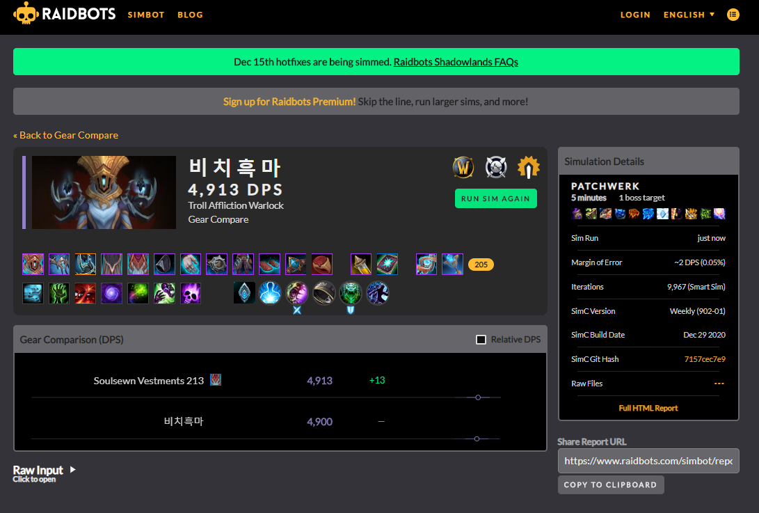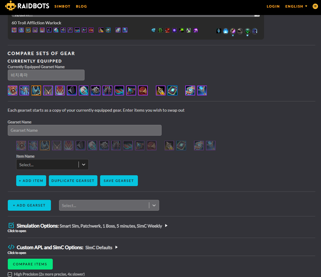 어느정도 와우를 했다면 심크라는 것을 한번쯤 들어봤을겁니다. 심크란(simc) simulation craft의 줄인말인데 내 캐릭터의 심크를 돌리면 내 캐릭터의 dps를 컴퓨터가 계산해주는것 입니다.