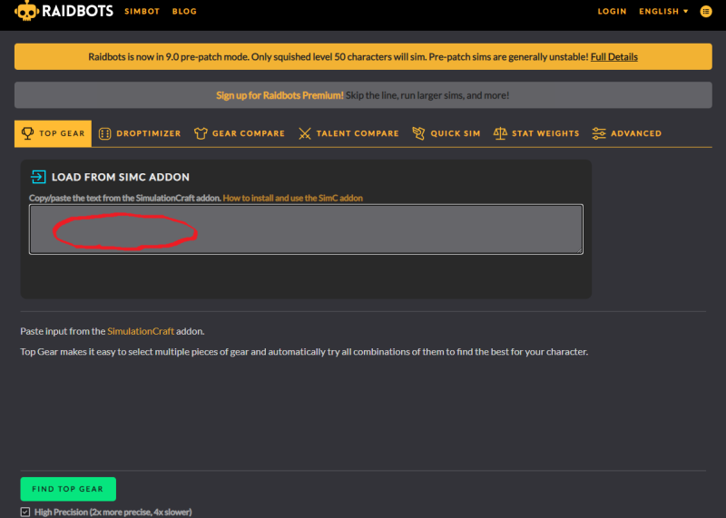 Copy/paste the text from the simulationcraft addon 이라고 보이실겁니다. 심크애드온을 이용하여 텍스트를 복사하라고 하네요. 저희는 이미했죠? 아까 와우인게임에서 /simc 를 써서 복사한것을 빨간동그라미 친곳에 컨트롤V 붙여넣기 하시면됩니다.