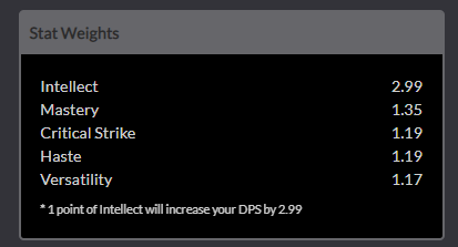 Intellect 2.9 Mastery 1.4 Haste 1.38 Critical Strike 1.35 Versatility 1.32