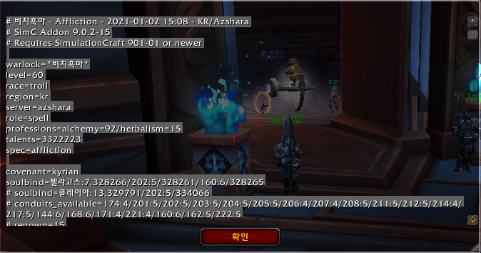 정상적으로 설치하였다면 와우 인게임에서 /simc 라고 채팅창에 치면