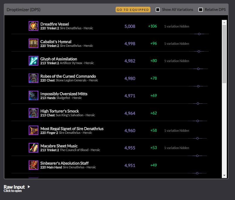 저에게 1순위는 Sire Denathrius 데나트리우스를 잡고 Dreadfire Vessel이라는 장신구를 먹는게 dps가 106이 오르는 제일 좋은 방법이라는 뜻입니다.