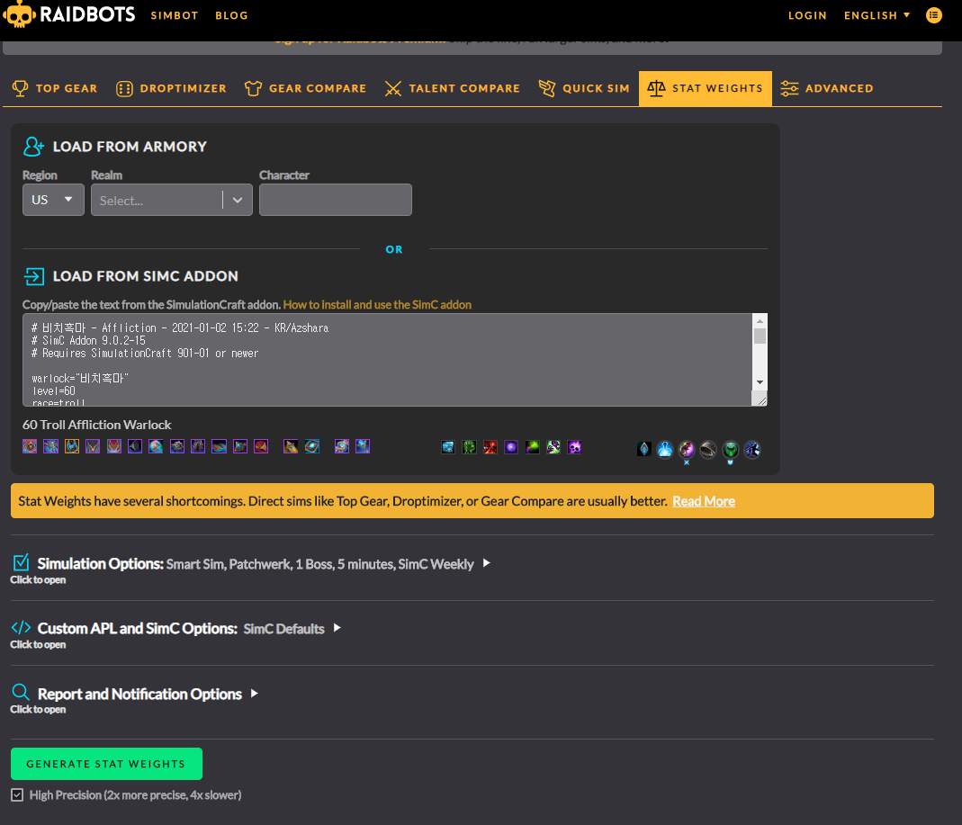 STAT WEIGHTS 를 들어가면 해당화면이 나오고 내정보를 입력한뒤 바로 GENERATE STAT WEIGHTS를 클릭하면됩니다.