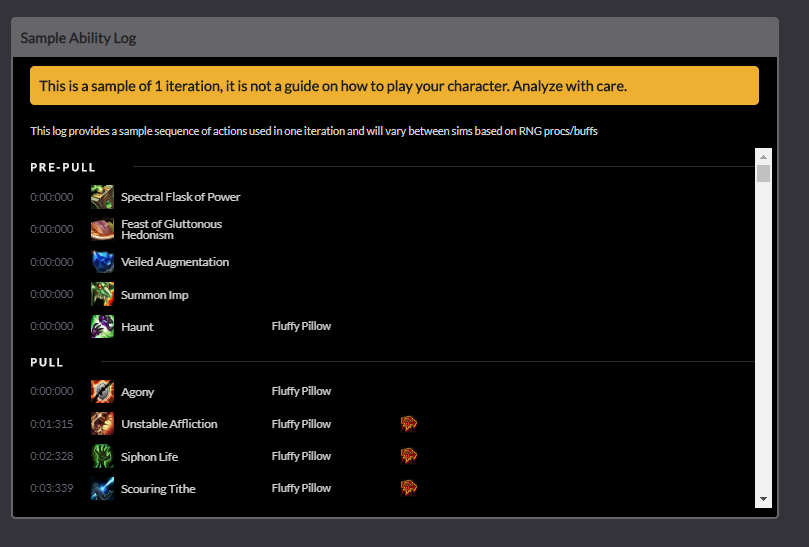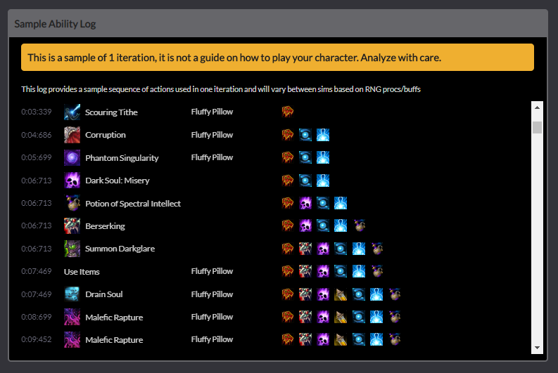 이게 컴퓨터가 계산한 고통흑마법사 딜사이클입니다. 이런식으로 본인캐릭터 딜사이클을 알수있습니다.