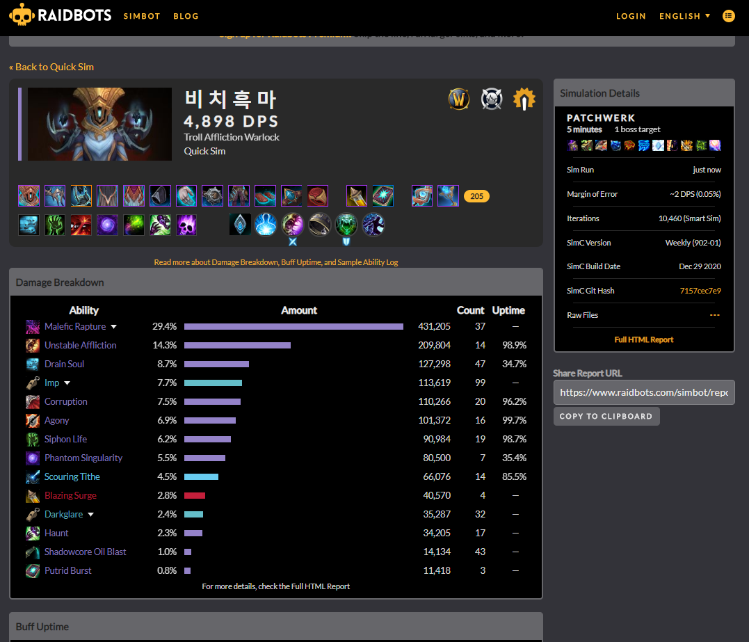 DPS가 현재 4898이 나오고 딜을 정확히 하였을때(컴퓨터가 딜사일클을 돌렸을때) Malefic Rapture(사악한 환희)가 29.4%, Unstable Affliction(불안정한 고통)이 14.3%, Drain Soul(영혼흡수)가 8.7%, IMP(펫 임프)가 7.7% 등등의 딜을 한다는것을 알수있습니다.