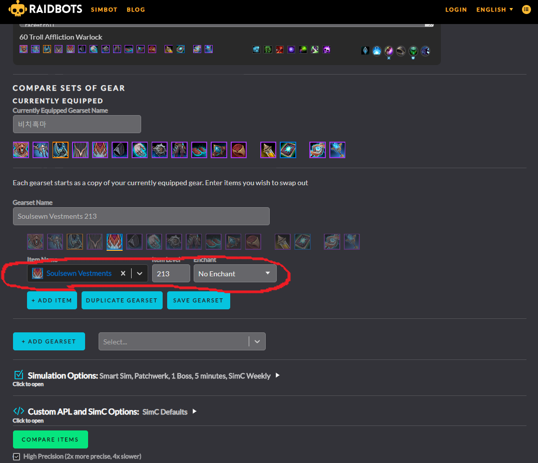 예를 들어보겠습니다. 내가 현재 184랩짜리 Soulsewn Vestments라는 가슴을 끼고있는데 이 아이템이 213랩짜리가 되면내딜이 얼마나 쌔지는지 궁금할때 사용하는것입니다. Item name에 아이템이름을 적으면되는데 한글은 안되고 영어로 적으셔야합니다. (아이템의 영어이름은 wowhead에 검색하면 보실수있습니다)