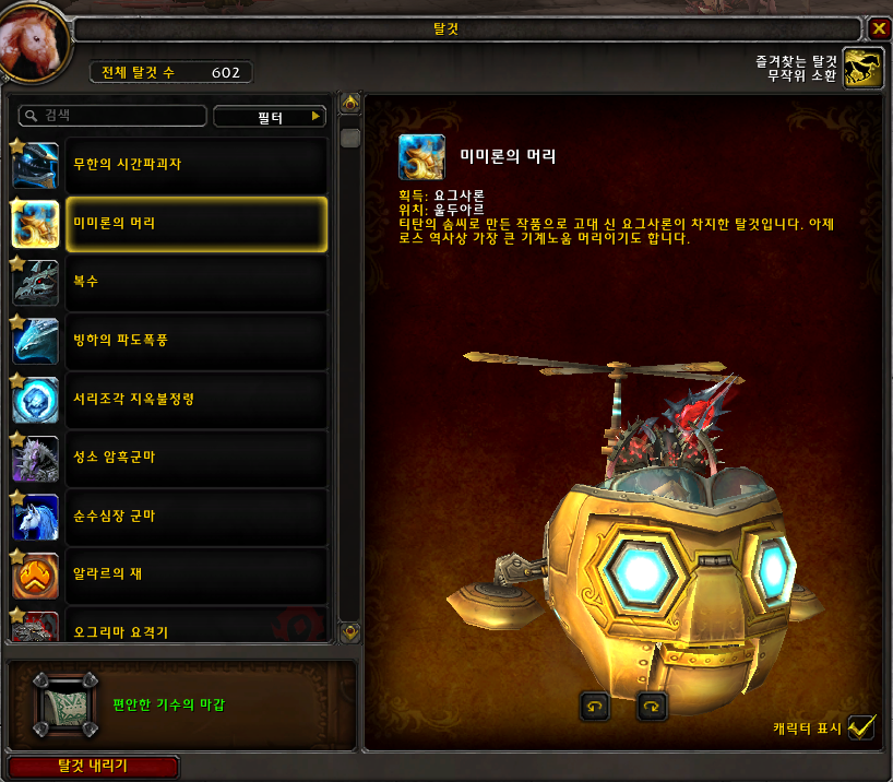미미론의 머리 탈것은 리치왕확장팩 울두아르에서 요그사론이 일정확률로 드랍합니다.