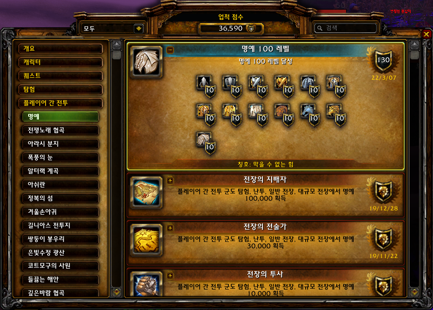 2022.03.07 명예 100레벨 획득 10점짜리 36590점