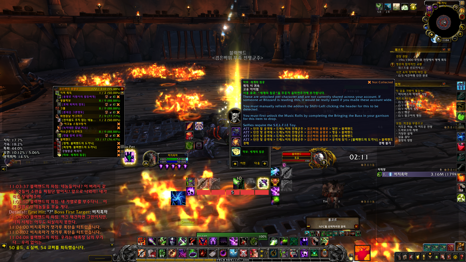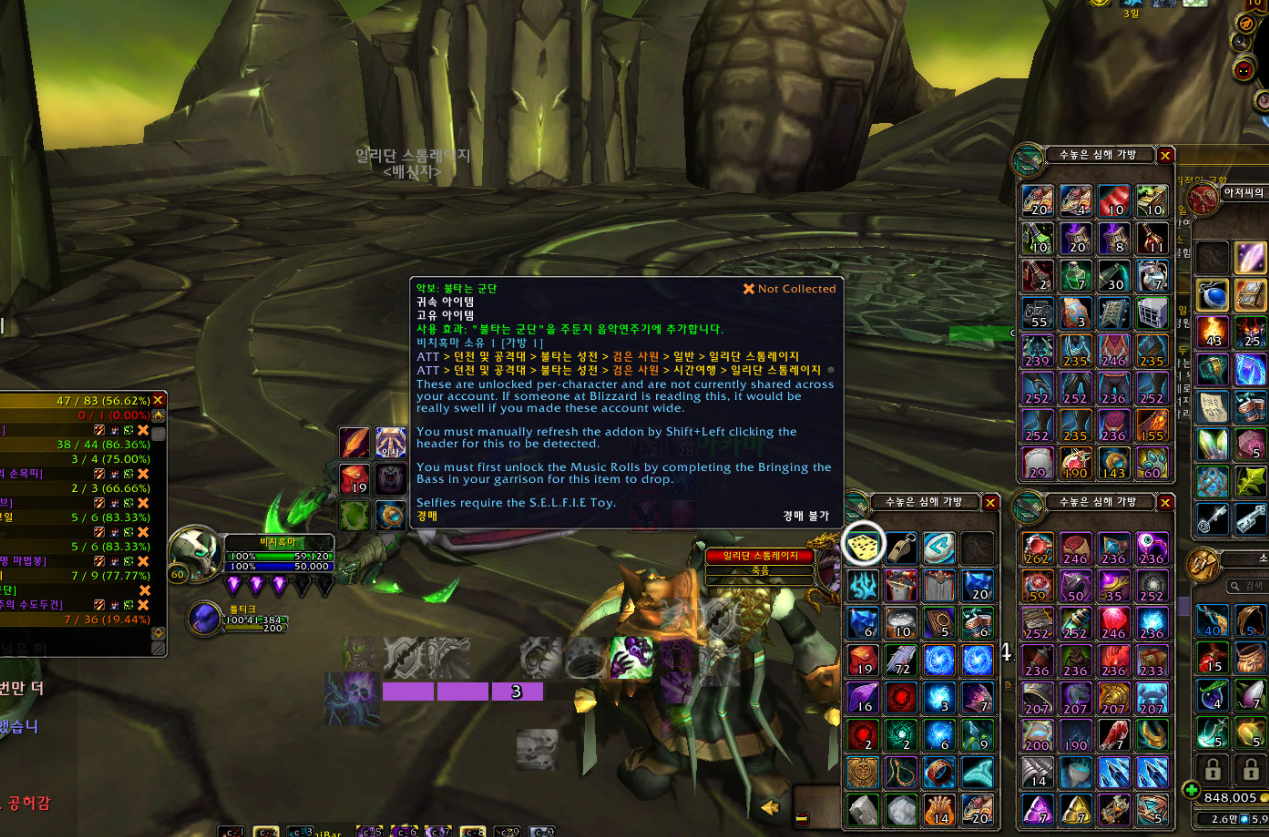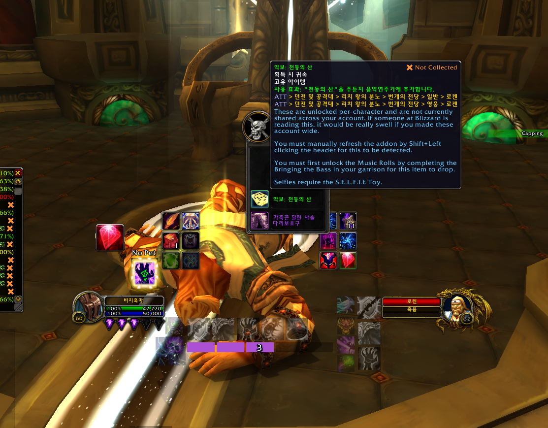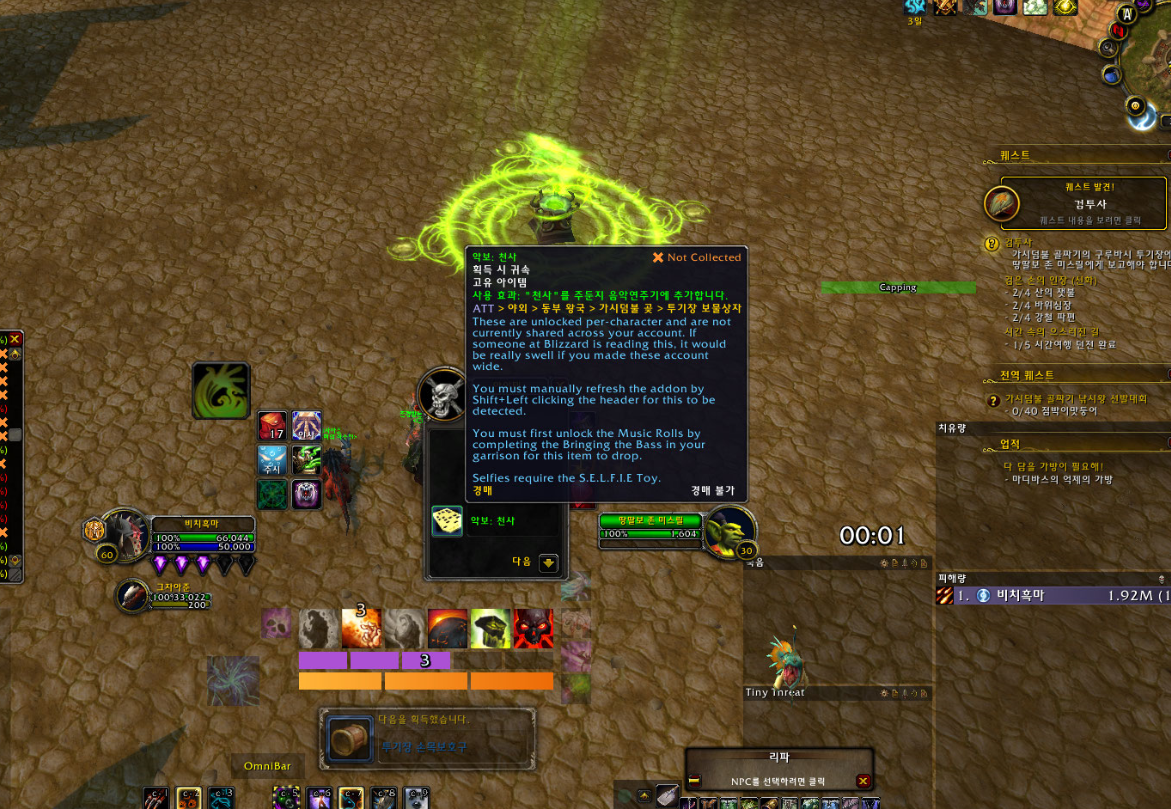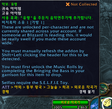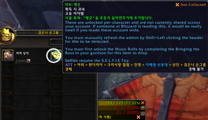 히트곡. 모두 수집. 성공적. 업적은 드레노어 확장팩 업적으로 주둔지에 음악연주기가 있는데 모든 악보를 전부 수집하는 업적입니다.
