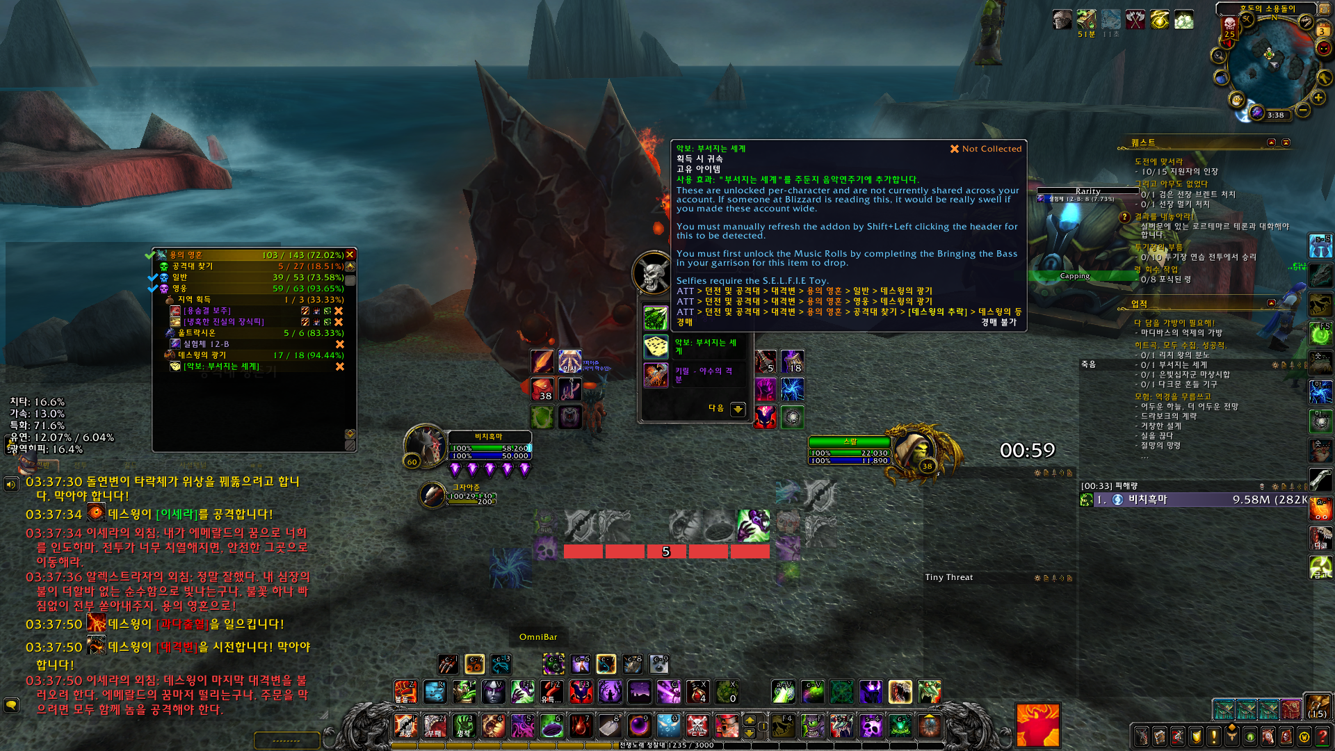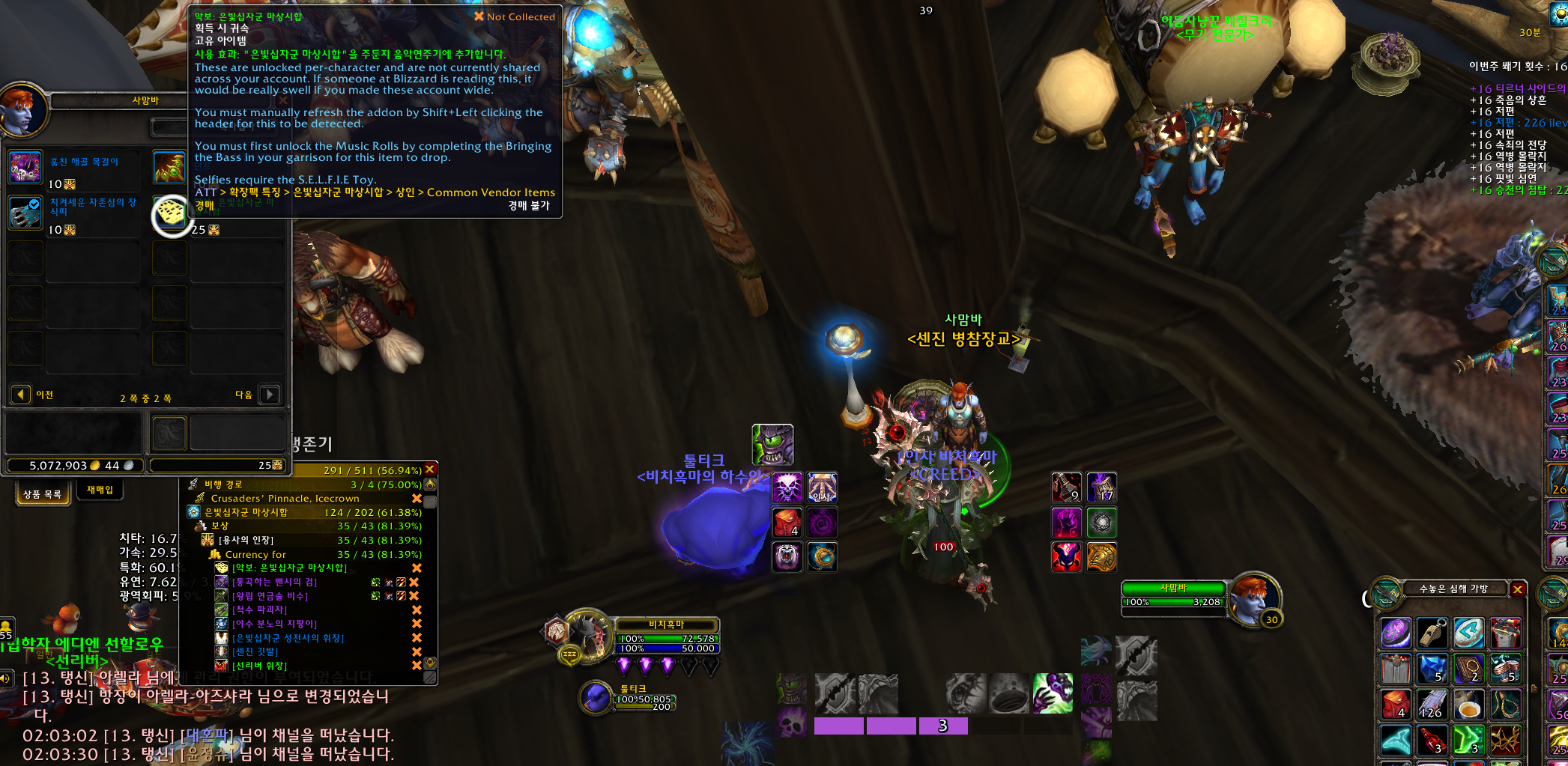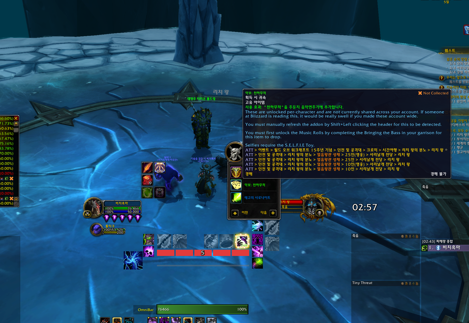 히트곡. 모두 수집. 성공적. 업적은 드레노어 확장팩 업적으로 주둔지에 음악연주기가 있는데 모든 악보를 전부 수집하는 업적입니다.