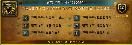 2022.03.18 완벽 공략의 대가(16단계) 획득 20점짜리 36765점 완벽 공략의 대가(16단계)업적은 토르가스트 스콜더스의 전당 / 골절의 방 / 영혼 제련실 / 얼음심장의 간극 / 모르트레가르 / 상층부 6곳을