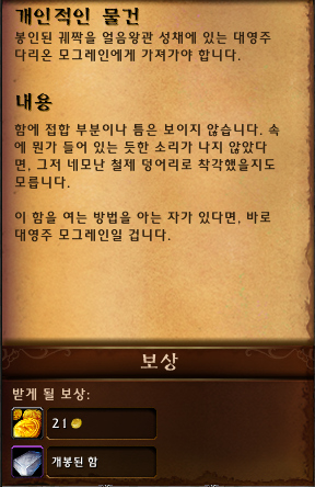 리치왕을 잡고나면 봉인된 궤짝이라는 아이템을 100%확률로 떨굽니다. 봉인된 궤짝은 개인적인 물건이라는 퀘스트 시작아이템 입니다.