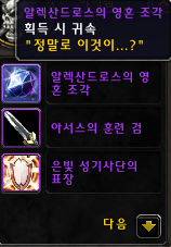 개봉된 함 안에는 알렉산드로스의 영혼 조각, 아서스의 훈련 검, 은빛 성기사단의 표장, 실바나스의 피, 제이나의 펜던트가 들어있습니다.