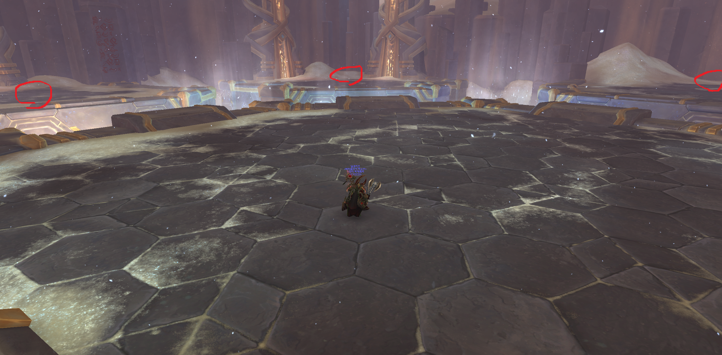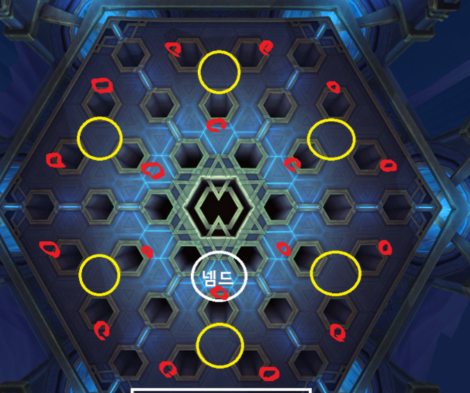 노란 동그라미가 구슬이 있는 위치입니다. 그러면 빨간동그라미 위치에서 노란 동그라미를 등지고 뒷걸음질로 구덩이로 빠지면 됩니다. 저주의 룬 대상자가 3명이고 총 6번이오니 3명중에 한명만 성공하면되고