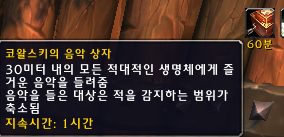 1시간짜리 버프가생깁니다. 30미터 내의 적대적인 생명체에게 음악을 들려줍니다. 그런데 음악을 들은 대상은 적을 감지하는 범위가 축소된다고 합니다. 아마도 애드나는 범위가 줄어드는것 같습니다.