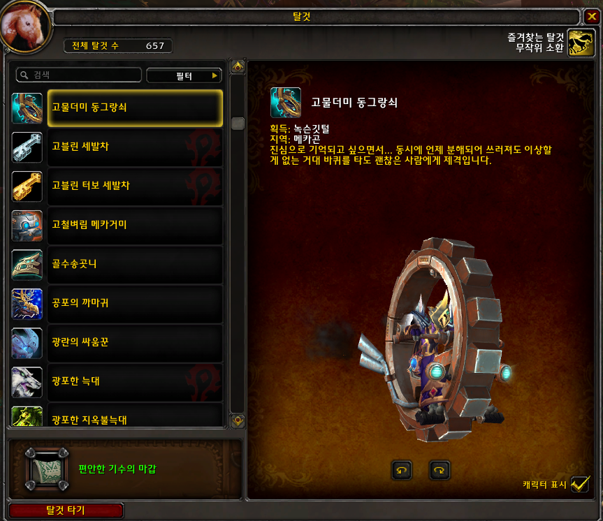 고물더미 동그랑쇠 탈것은 격전의 아제로스 메카곤에서 획득가능한 탈것 입니다.