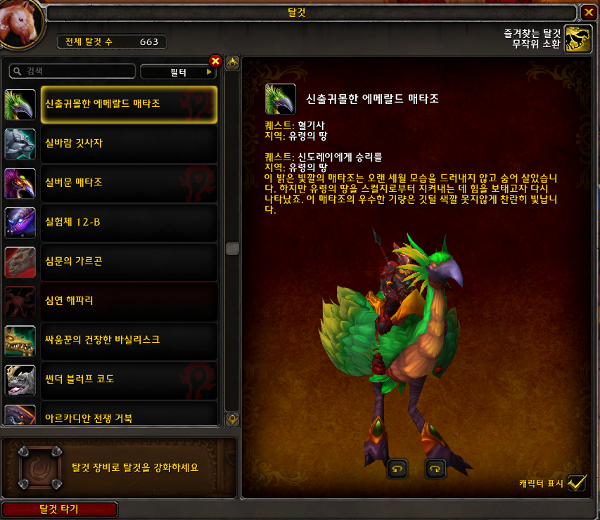신출귀몰한 에메랄드 매타조는 9.2.5 에 추가된 탈것으로 블엘전용 탈것입니다.