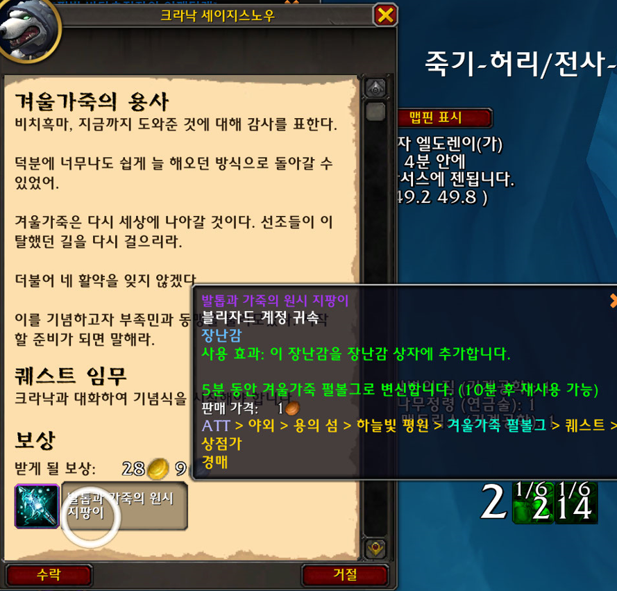 2023.03.31 겨울가죽 언어 전문가 획득 10점짜리 40910점 겨울가죽 언어 전문가는 용군단 업적으로 펄볼그 평판관련 업적입니다. 10.0.7패치가되면서 겨울가죽 펄볼그 평판을 올릴수 있게되었습니다.