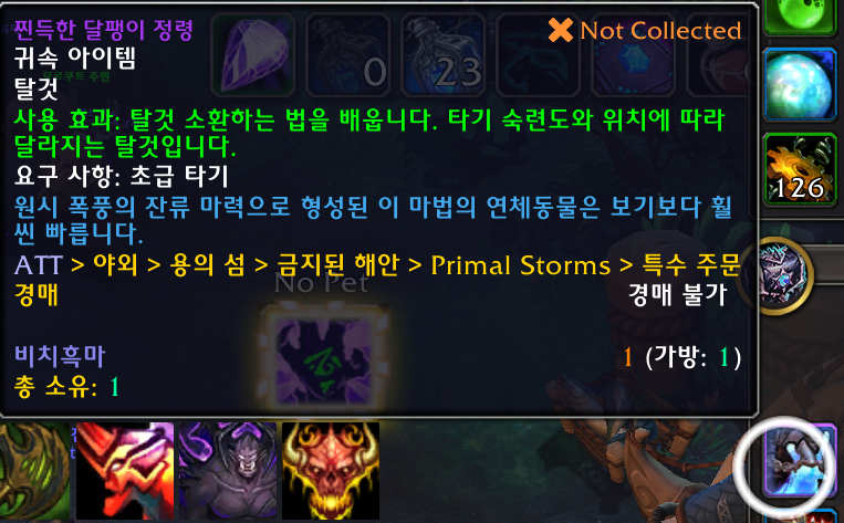 찐득한 달팽이 정령 탈것은 용군단 탈것으로 금지된해안에서 정령 잔재 점액 50개를 모아서 만듭니다.