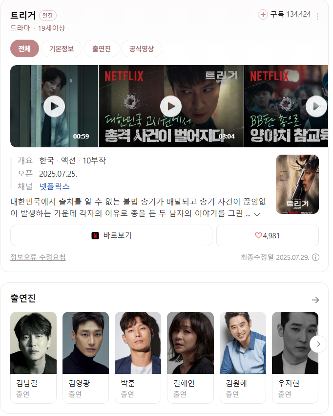 하지만 단점들도 너무 많았다. 우선 각 에피소들이 너무좋고 각에피소드의 피해자들 캐릭터 하나하나가 다 좋고 피해자들 마음에 공감되고 다좋았는데 해결되는 과정이 너무 현실성이 떨어진다는 느낌을 자주받았다. 총격전이 벌어지는데 경찰들이 출동도 안하고 매번 김남길 혼자 해결하고... 뭐 그건 그렇다치고 제일 별로였던건 액션드라마인데 액션이 허접하다는 것이다. 보면서 와 액션 지린다 이런 느낌을 전혀 받을수없고 총을 걸어서 피하고... 액션이 너무 떨어졌다.