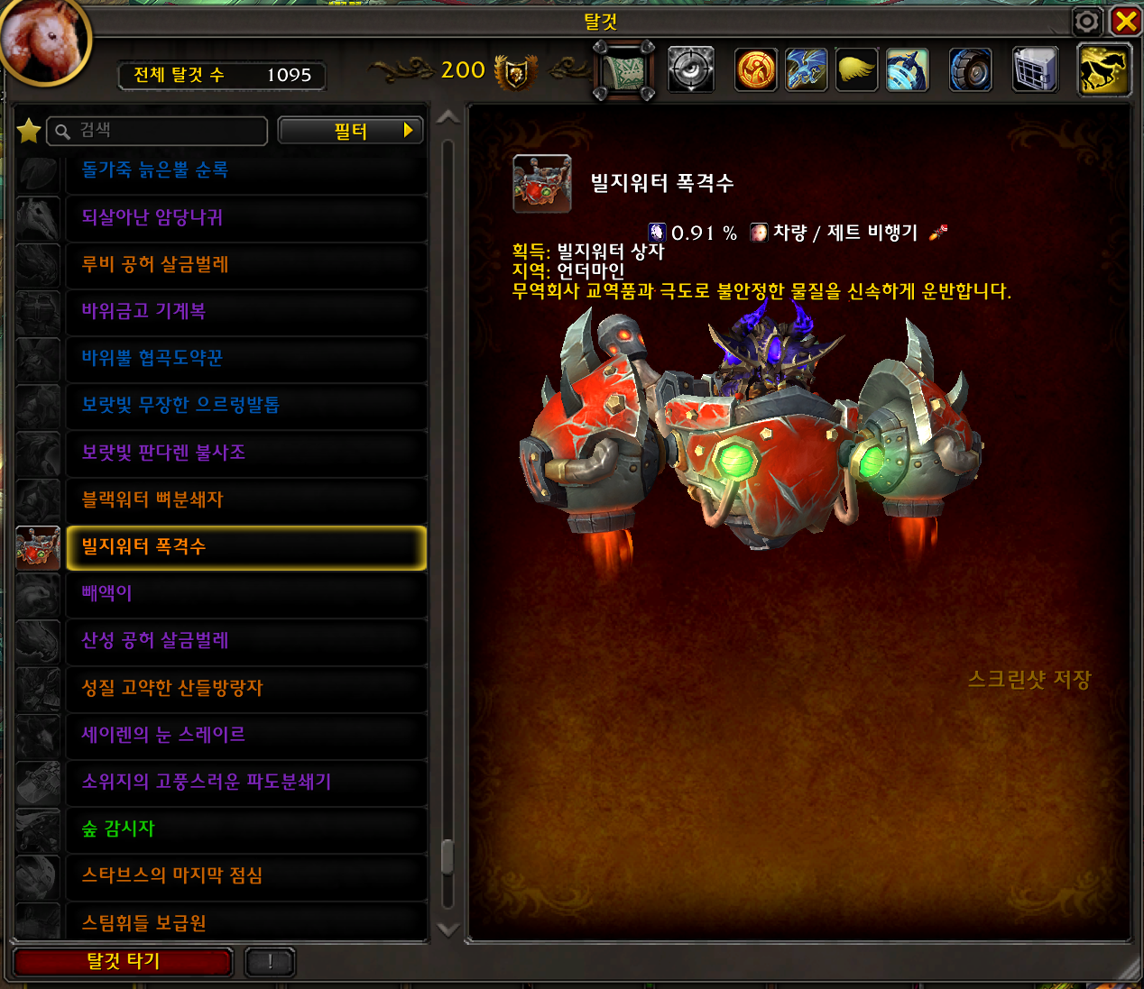 빌지워터 폭격수 탈것은 내부전쟁 확장팩 탈것으로 2시즌 언더마인 빌지워터 평판 추가상자에서 줍니다.